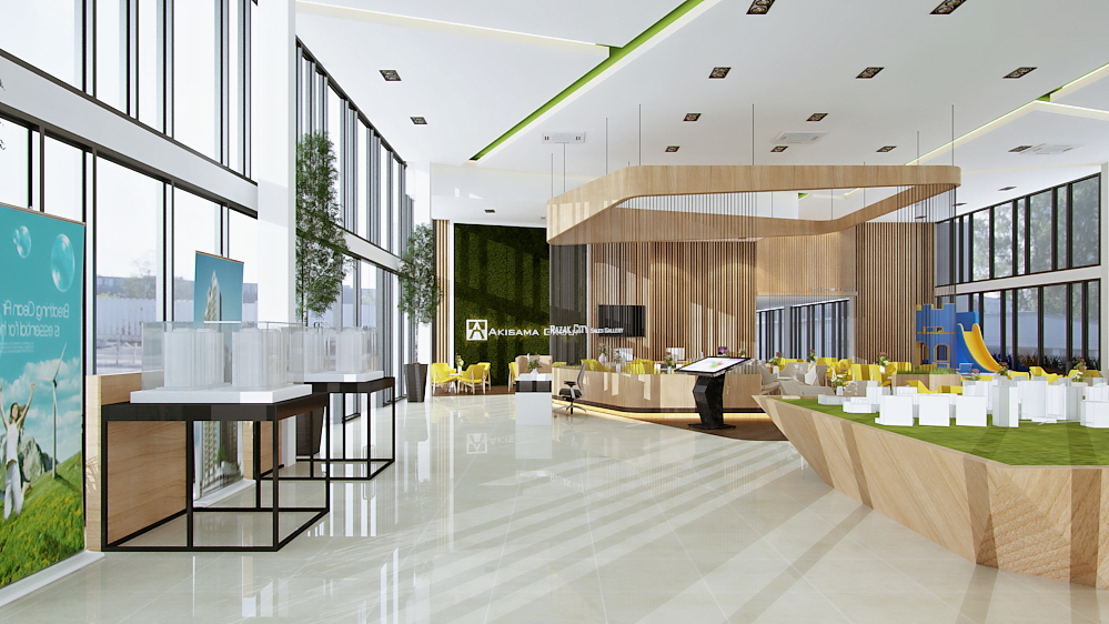 An approx 9200sqft sales gallery for Akisama group in Salak Selatan. Inspired by modern contemporary, a full height of artificial green wall blend with the usage of timber stripe, natural material create a sense of calm and relaxing ambient to the space. The space was designed to exude home feeling to visitor.