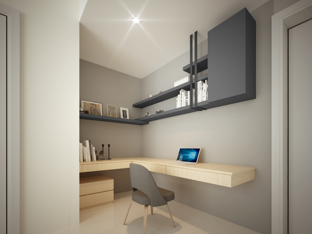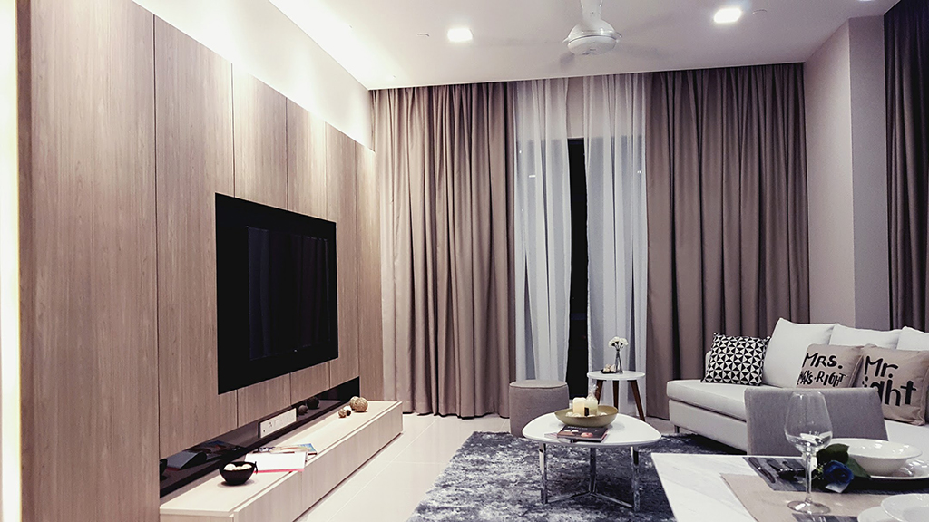 Type-C is a 2-room condominium in 1159 square feet. Modern contemporary is the concept for type-C show unit which located in the city center. Open floor plan for living, dining, kitchen & study area make the unit look spacious. Wall between dining and kitchen is replacing by kitchen peninsular.