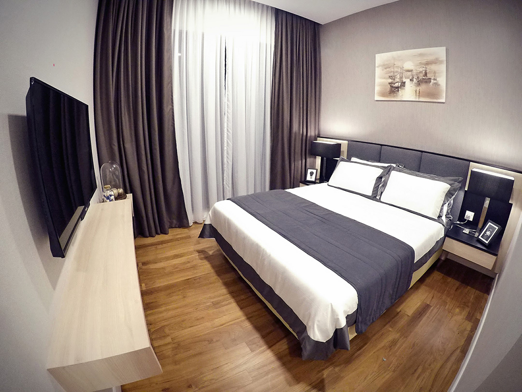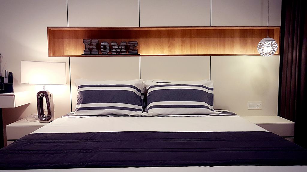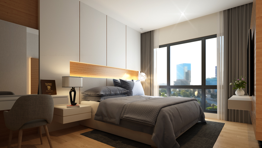 Master bedroom is in white colour with a touch of light wood. Combination of the headboard, bedside table & dressing table in one single cohesive unit make the room clean and elegant. Bedroom 2 is to create warm ambiance with mostly warm wood furniture and with add of dark grey colour make it look modern.